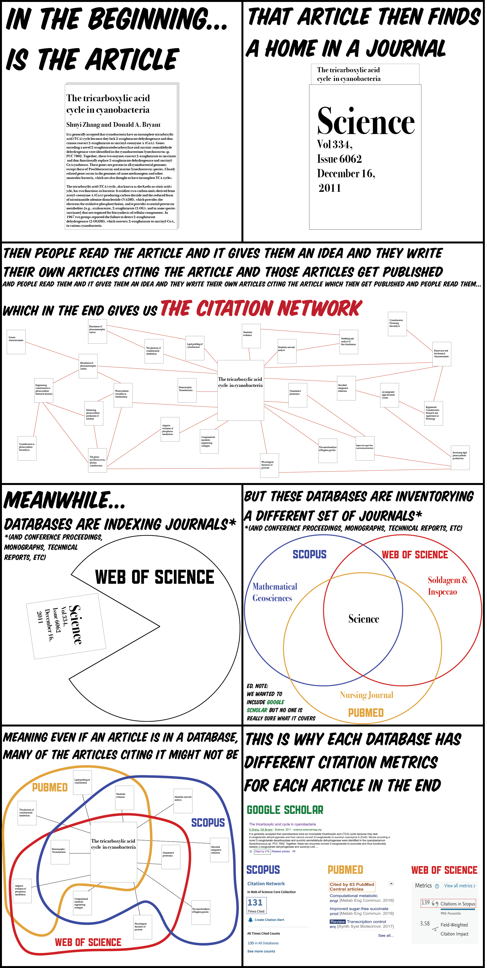 Comic style infographic which explains why different databases have different citation counts for the papers indexed within the databases.(CC-BY-NC-4.0)